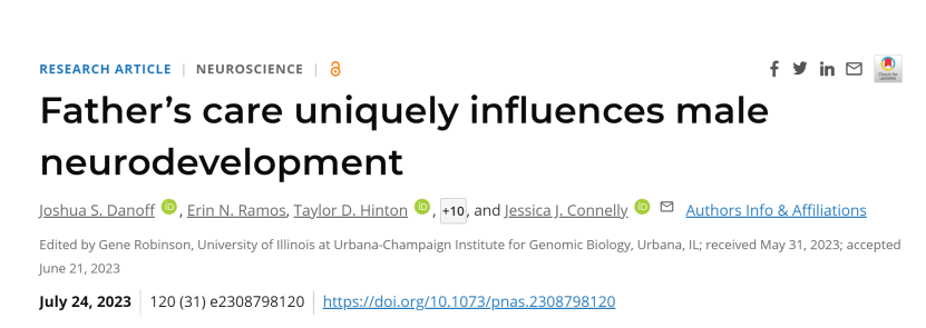 [1] Danoff JS, Ramos EN, Hinton TD, et al. Father's care uniquely influences male neurodevelopment. Proc Natl Acad Sci U S A. 2023;120(31):e2308798120. doi:10.1073/pnas.2308798120