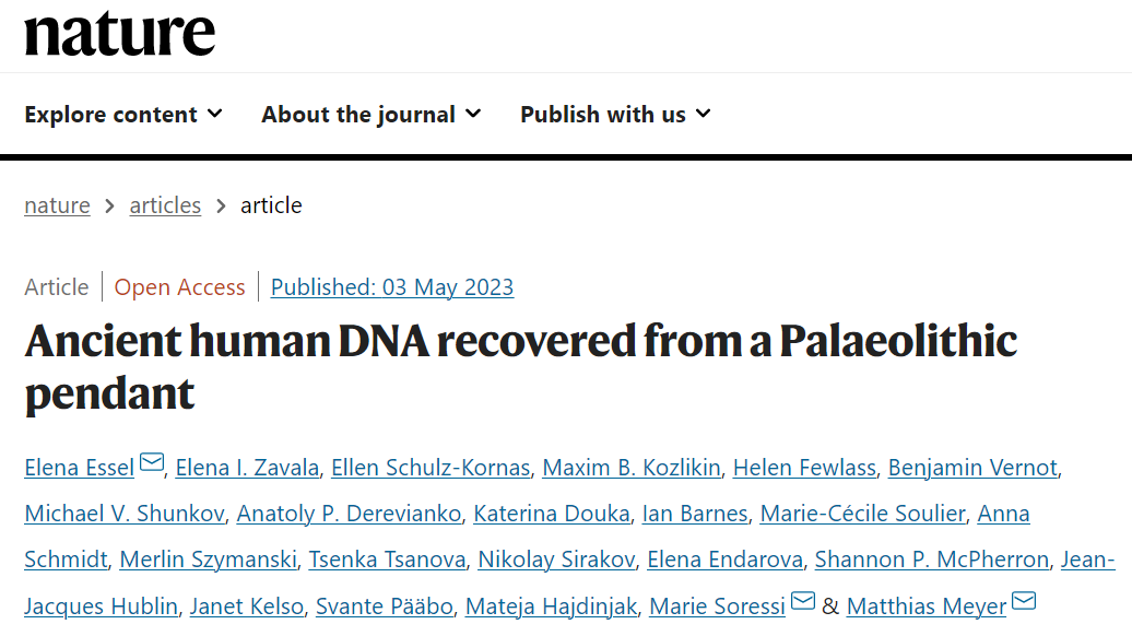 2023年5月3日, 马克斯·普朗克进化人类学研究所、莱比锡大学、莱顿大学等机构的研究人员合作,在 Nature 期刊发表了题为:Ancient human DNA recovered from a Palaeolithic pendant 的研究论文。