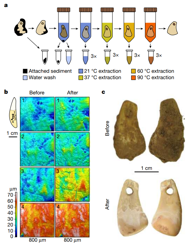 在这项研究中,Elena Essel、Matthias Meyer、 Marie Soressi 等人开发了一种非破坏性的DNA提取方法,将物品浸泡在磷酸钠缓冲液中,逐渐升高温度。藏在古代骨骼和牙齿人造物品中的DNA会释放到溶液中,从而可进一步测序和分析。