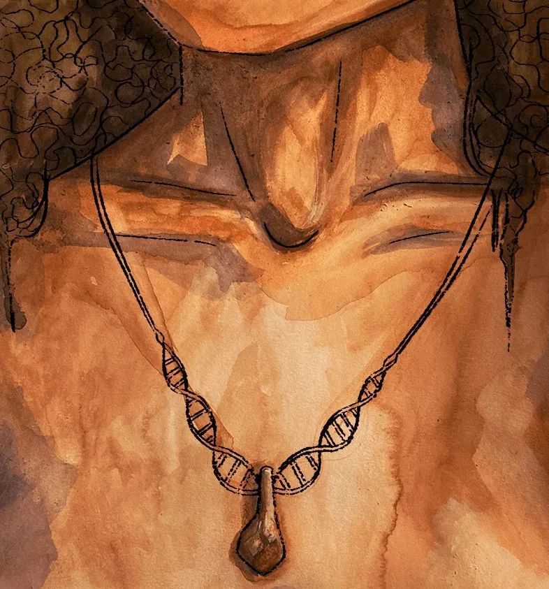 坠饰艺术再现图,图中吊坠绳为DNA螺旋样式,图片由Myrthe Lucas绘制