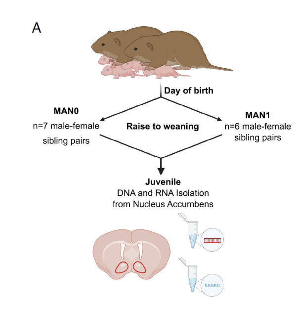 文章通过两种不同的父母照料方式来检验父母双亲的照顾对后代田鼠神经发育的影响。第一种方式为早期父母高度照顾模式(MAN1)以及对照组(MAN0),两组分别饲养幼鼠至断奶(图2),第二种方式是对田鼠自然的育儿观察,即对它们的育儿行为不进行任何限制。
