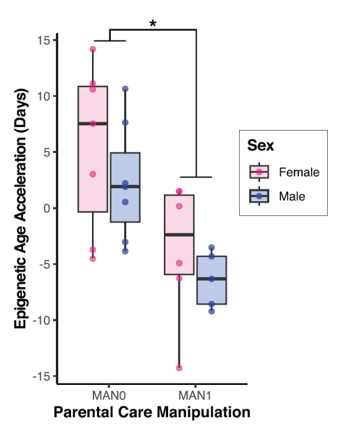 使用DNA甲基化可以判断预估的发育速度与实际年龄之间的差异,故研究使用了田鼠伏隔核的DNA预测其表观遗传年龄(图3),发现在早期接受更多的父母双亲的照顾,减缓了小鼠表观遗传衰老。
