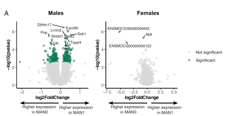 在MAN1雄性田鼠子代中发现高表达的基因有175个,低表达的基因有146个,同时发现了催产素受体基因(OXTR)的表达增加。而在雌性中,仅发现有三个基因有差异表达(FDR<0.1)。(图4)。