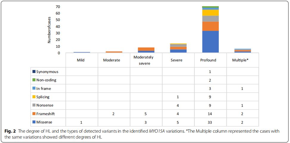 MYO15A基因(OMIM: 602666)位于17p11.2,长71,097 bp,包含66个外显子,可编码多种剪接转录本,最长转录本达11,876nt,编码 35390个氨基酸残基,约365 KDa大。MYO15A编码的蛋白是myosin XVa,属于非传统肌球蛋白,广泛分布于人内耳、脑垂体、肝脏、卵巢、睾丸、肾脏等组织器官,参与囊泡运输、细胞吞噬等重要细胞功能。在内耳中,myosin XVa主要分布于耳蜗及前庭毛细胞静纤毛的顶端,参与耳蜗毛细胞内肌球蛋白组织结构及毛细胞静纤毛的伸长。 MYO15A与遗传性耳聋 NSHL中最常见的变异基因是GJB2、SLC26A4、CDH23、MYO15A和OTOF基因等。MYO15A变异于1995年在印尼巴厘岛的一个2000多名居民的村庄中确定,耳聋表型为双耳语前非进展性重度——极重度感音神经性耳聋,一般不伴有前庭功能障碍。另外,MYO15A杂合突变可能与伴有感音神经性耳聋的史密斯•马吉利综合征(Smith-Magenis syndrome)相关,临床表现为中度智力障碍及多种先天性异常,包括轻度颅面及骨骼发育异常、行为问题、睡眠障碍、身材矮小、心脏及肾脏发育异常,发病率为1/25,000。 MYO15A变异及致聋表型分析 解放军总医院戴朴教授课题组于2013年报道了一个MYO15A复合杂合突变致聋的家系,提示MYO15A是中国常染色体隐性NSHL致聋基因之一。近日,戴朴教授课题组对来自74个家庭中的81例患者通过下一代测序(next-generation sequencing, NGS)鉴定了MYO15A基因至少一个致病性、可疑致病性或临床意义未明的变异102个,并评估MYO15A基因型与NSHL表型的相关性。这是迄今为止最大规模的,主要关注MYO15A变异及其对NSHL表型特征影响的研究。该研究成果“Analysis of the genotype–phenotype correlation of MYO15A variants in Chinese non-syndromic hearing loss patients”于2022年3月27日在《BMC Medical Genomics》(IF=3.063)杂志上发表。 研究纳入1842个NSHL家庭的2263例患者,年龄从出生后数日至65岁, 1654例有语前聋, 609例语后聋;轻度71例,中度238例,中重度179例,重度512例,极重度1263例。全部受试者表现为双耳非综合征型感音神经性聋,绝大部分表现为语前(92.59%,75/81)和对称性(97.53%,79/81)耳聋,只有少数表现为语后(7.41%,6/81)和不对称(2.47%,2/81)耳聋(Fig.1)。 研究共检测到MYO15A纯合变异患者4例,复合杂合变异患者77例。共发现了102个MYO15A变异。最常见的变异类型是错义突变(44/ 102,43.14%),之后依次是移码突变(27/ 102,26.47%)、无义突变(14/ 102,13.72%)、剪切突变(10/ 102,9.80%)、框内突变(4/102,3.92%)、非编码突变(2/102,1.96%)和同义突变(1/102,0.98%)(Fig.2)。变异主要分布在MYO15A基因的41个外显子上,包括78个新变异和24个已报道的变异,均经Sanger测序验证(Fig.3)。 根据ACMG指南,102个MYO15A变异中,致病性变异(P)共计40个,可能致病性变异(LP)共计24个,临床意义未明变异(VUS)共计38个。具有相同变异的病例表现出不同的表型,通过相关性分析,变异位点的致病性评级与听力损失程度不相关。 然而,当将影响力较高的变异类型(如移码突变、剪切突变、终止突变等)定义为蛋白截断变异(PTVs)时,通过分组比较分析,推断MYO15A基因的单等位基因的或双等位基因的PTVs可能增加听力下降的风险。 有趣的是,研究发现了一个MYO15A同义变异,NCBI ClinVar和DVD数据库均表明其致病性。该同义突变(c.8340G>A(p.Thr2780Thr))预测可导致45号外显子缺失116 bp,引起密码子提前终止,是唯一被认为致病性的同义变异。 相关治疗 研究结果显示,中国NSHL人群中有3.58%与MYO15A基因变异有关。大多数受影响个体表现为重度到极重度听力损失,但也有少数病例显示轻度到中度耳聋。对于轻度至中重度感音神经聋的患者,可尽早佩戴助听器,而对于重度或极重度感音神经性聋患者,人工耳蜗植入及术后言语康复治疗是首选治疗方式。部分研究结果也显示人工耳蜗植入在MYO15A变异致聋的患者中取得了良好疗效。另外,对MYO15A 突变的诱导多能干细胞(induced pluripotent stem cells, iPSCs)的细胞系进行基因校正与内耳毛细胞的诱导分化也取得了成功,证明了基因校正能有效逆转 MYO15A 突变导致的毛细胞样细胞的形态和功能缺陷,为今后人类MYO15A突变致聋的药物治疗带来了全新希望。