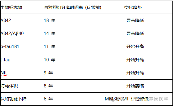 Aβ42 和 Aβ42/Aβ40 比值变化最早且持续时间最长,可作为 AD 最早期预警指标。